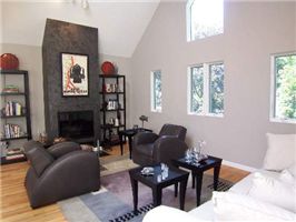skylights in living room, white kitchen with